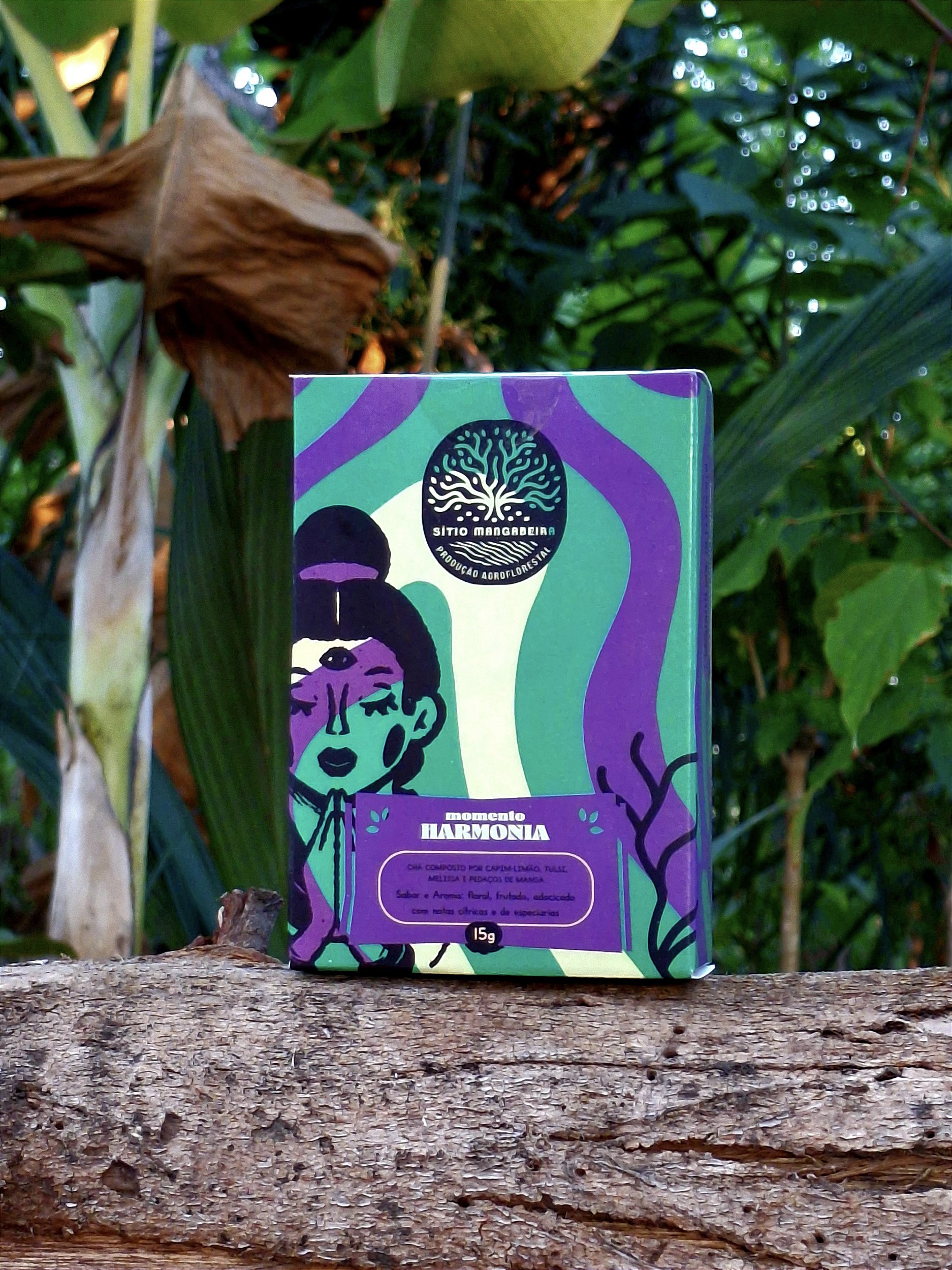 Mini caixa da mistura de ervas Momento - 15g da mistura de ervas Harmonia, embalada em sachê de celulose compostável biodegradável, e caixa reciclável.